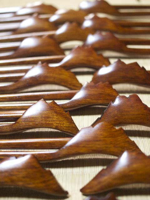 水や流れを抽象的に表現した箸。ゴツゴツした山の形とは対照的な流線型の柔らかな形。