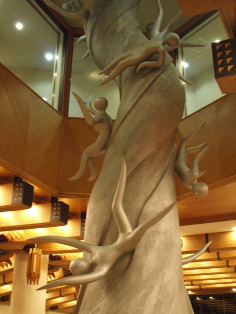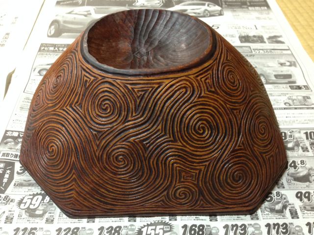 ノートパソコンくらいの大きさで、内側と底が刳りぬいてあり、どちらも器として使えるようになってます。そして、びっしりぐるぐるが彫ってあります。
